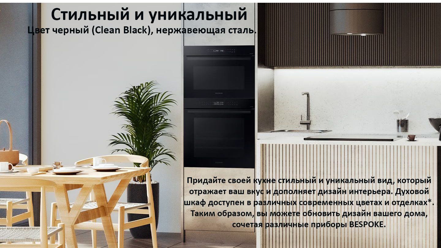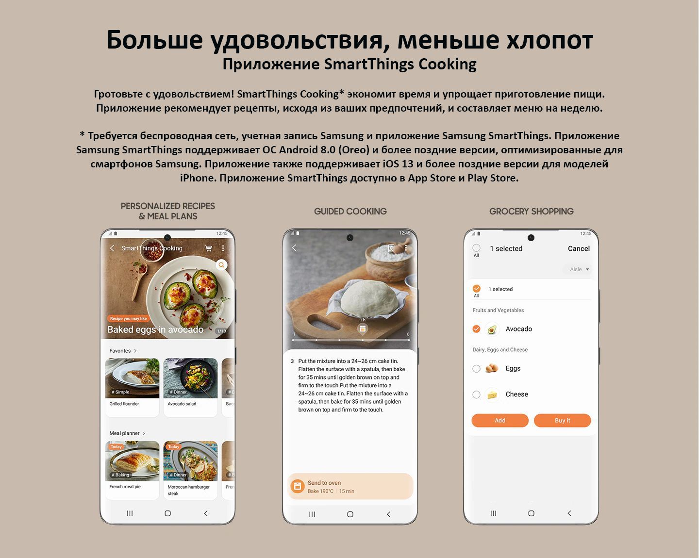 Великая вместимость (76 л), конвекция, гриль (верхний/нижний), мягкое закрытие дверцы (Soft‑Close), керамическое покрытие камеры, Wi‑Fi / поддержка приложения SmartThings, LED‑дисплей, защита детей, таймер, телескопические направляющие.