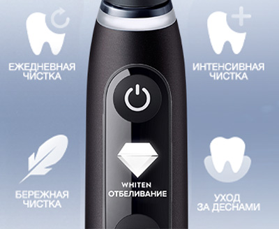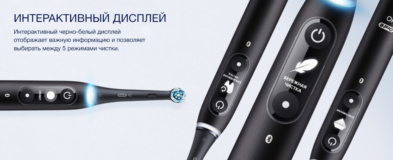 Интерактивный дисплей отображает и позволяет выбирать между 5 режимами чистки, информацию об износе сменной насадки и 2-минутный таймер, обеспечивая уникальную персонализированную процедуру чистки.