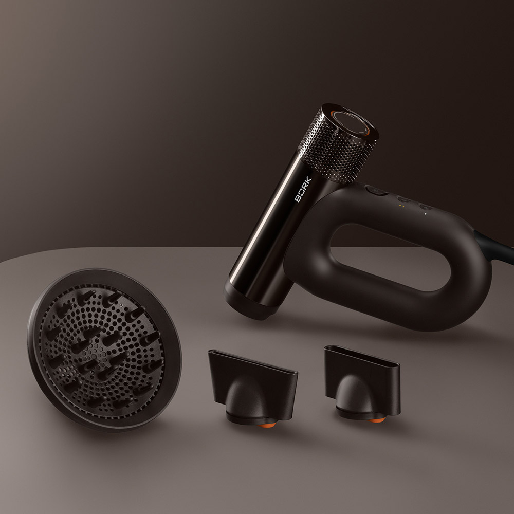 Эргономичная рукоятка снижает нагрузку на кисть, насадки с магнитным креплением идеальны для сушки, укладки и формирования объема. Для хранения фена и аксессуаров вы можете заказать лаконичную подставку.