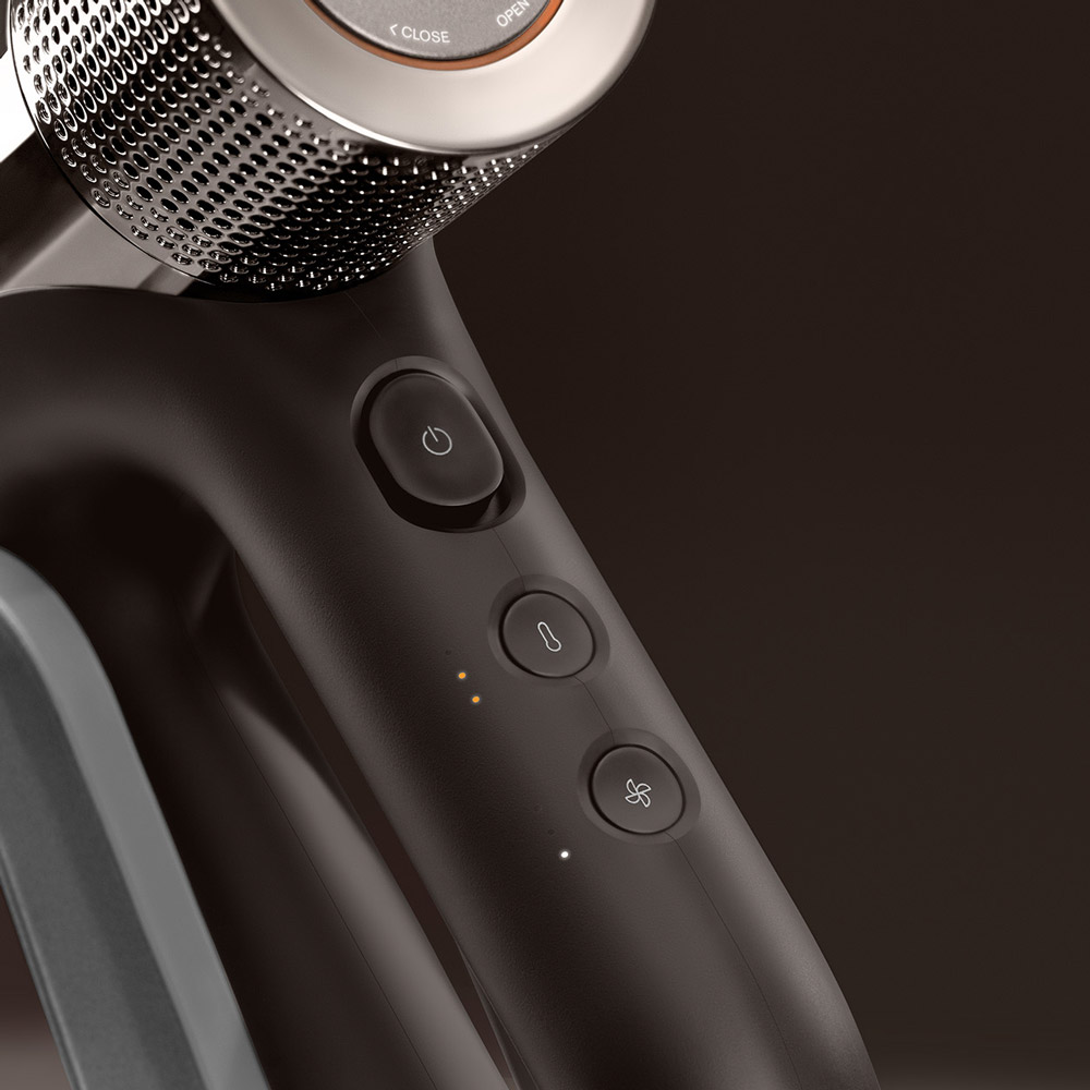 Специальный датчик замеряет температуру потока 140 раз в секунду для защиты волос от перегрева. На выбор доступно три температурных режима, а также функция холодного обдува.
