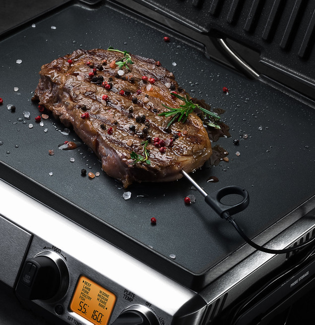 Выберите один из 4 типов прожарки (Rare, Medium Rare, Medium, Well Done) под ваши предпочтения. Встроенный термощуп помогает полностью контролировать температуру внутри мяса для точного результата. После достижения нужного показателя система подаст звуковой сигнал.
