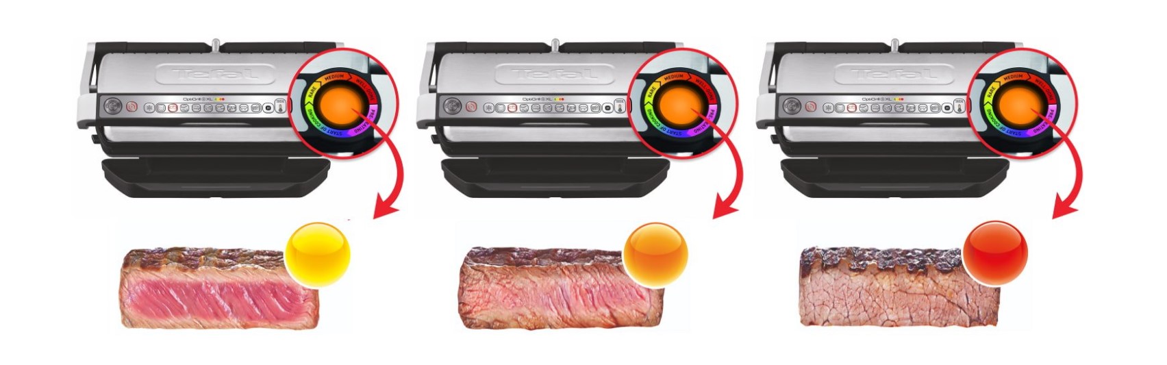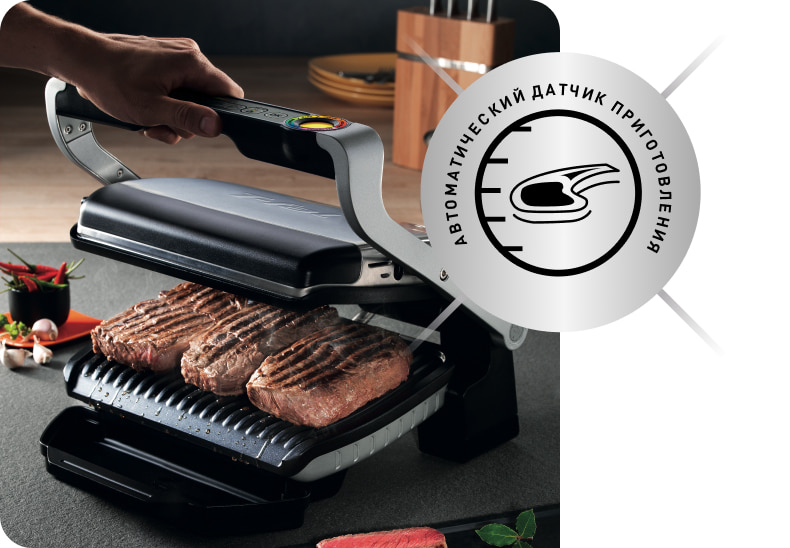 Всё под контролем — запатентованный круговой дисплей отражает каждый этап приготовления. Как только степень прожарки изменится, он сразу же сообщит об этом с помощью звукового сигнала и цветового индикатора: жёлтый цвет — с кровью, оранжевый — средней прожарки, красный — полной.