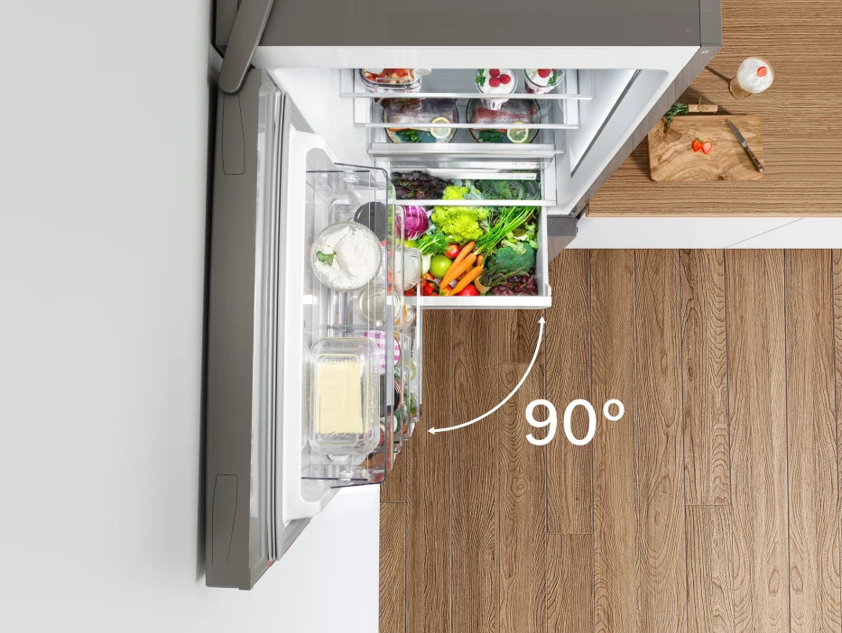 Холодильники VitaFresh могут быть установлены на кухне вплотную к мебели и стенам, без зазоров сзади и сбоку. Кроме того, дверца холодильника открывается на 90 градусов, не требуя дополнительного пространства, при этом ящики, находящиеся внутри, легко вынимаются.