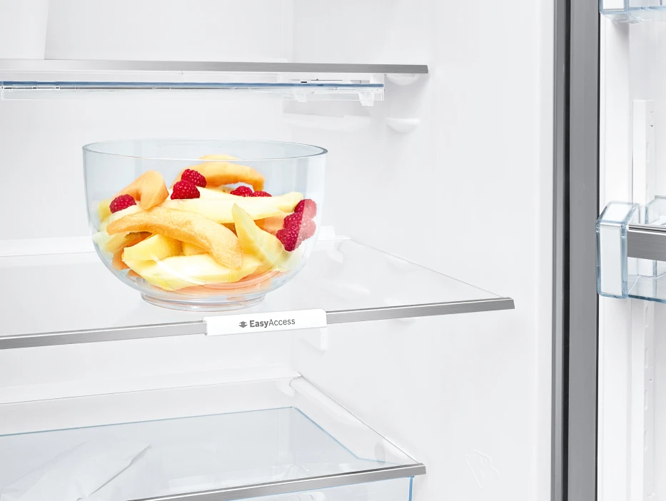 Полки EasyAccess из закаленного ударопрочного стекла очень удобны в использовании благодаря тому, что они плавно выдвигаются даже при полной загрузке, чтобы вы могли с легкостью достать продукты из самого дальнего уголка холодильника.