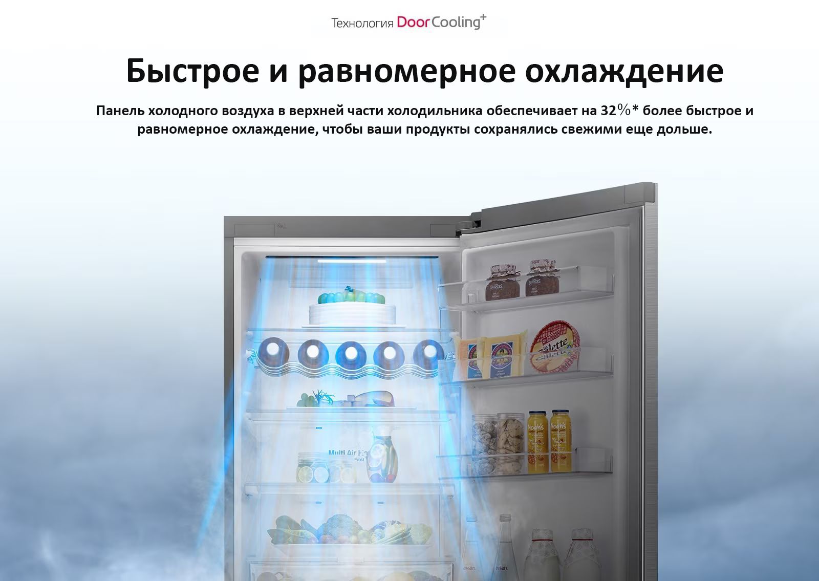 Door Cooling+, Зона для овощей Fresh Balancer, Moist Balance Crisper, Smart Inverter Motor, складная полка
