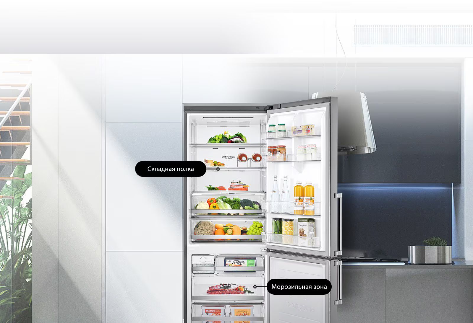 Этот удобный современный холодильник оснащен складной полкой для хранения высоких бутылок, а также закрытой морозильной зоной, что снижает необходимость замораживания и размораживания определенных продуктов.