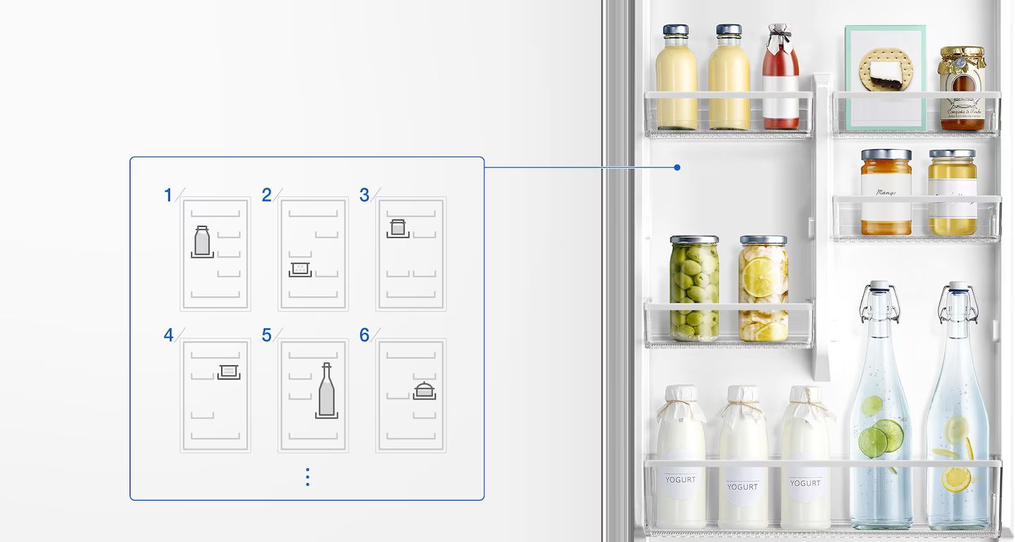 Настройте пространство в двери холодильника с помощью 4 дверных съемных полок, которые позволяют легко приспособить их для хранения емкостей самых разных размеров. Возможность регулировать их по высоте позволяет использовать пространство по максимуму.