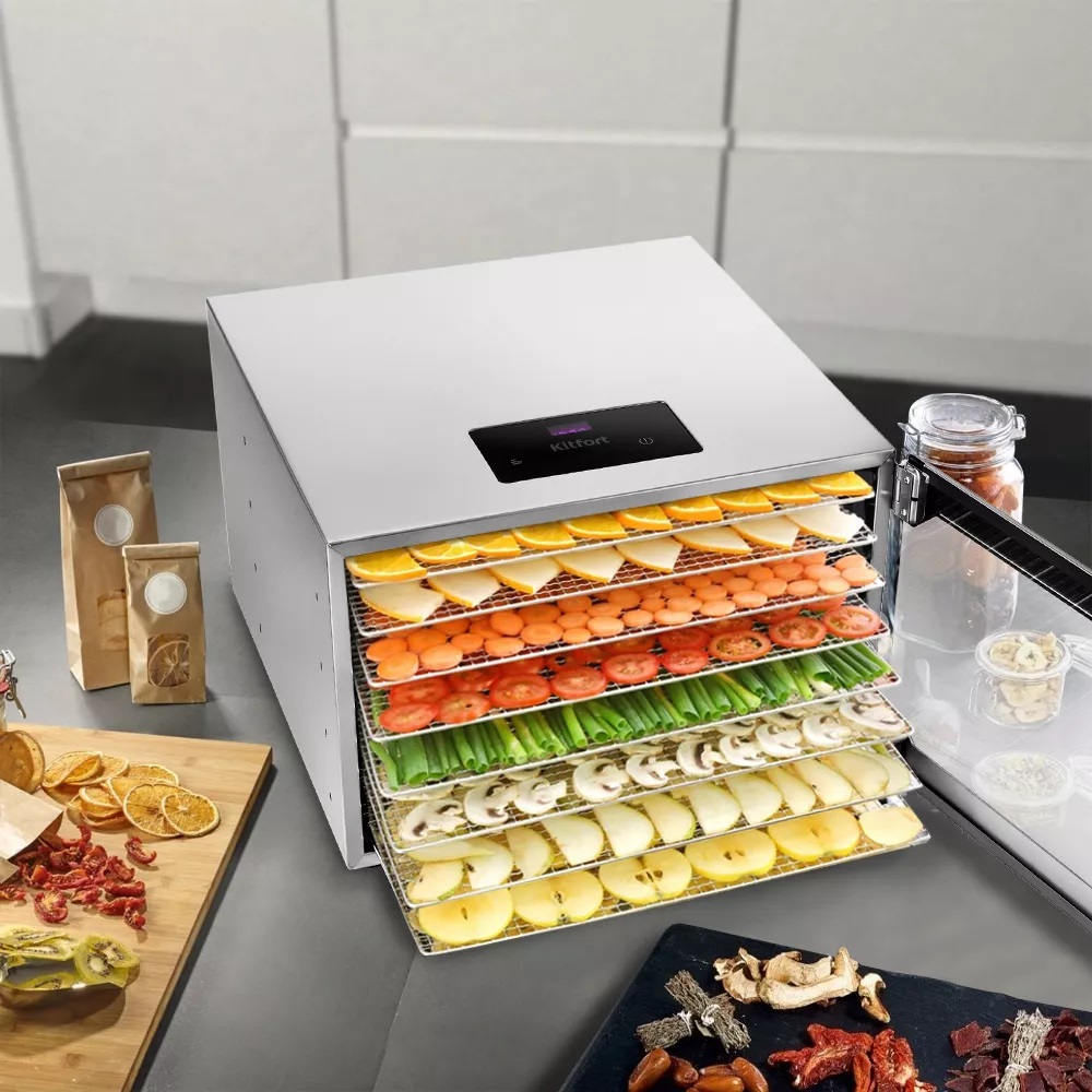 С цельнометаллической электросушилкой Kitfort KT-1922 у вас под рукой будет всегда живая еда. Прибор насушит на всю зиму помидоры, кабачки, баклажаны, клубнику, абрикосы, персики, тыкву, грибы, зелень, мясо, рыбу, хлеб и многое другое.