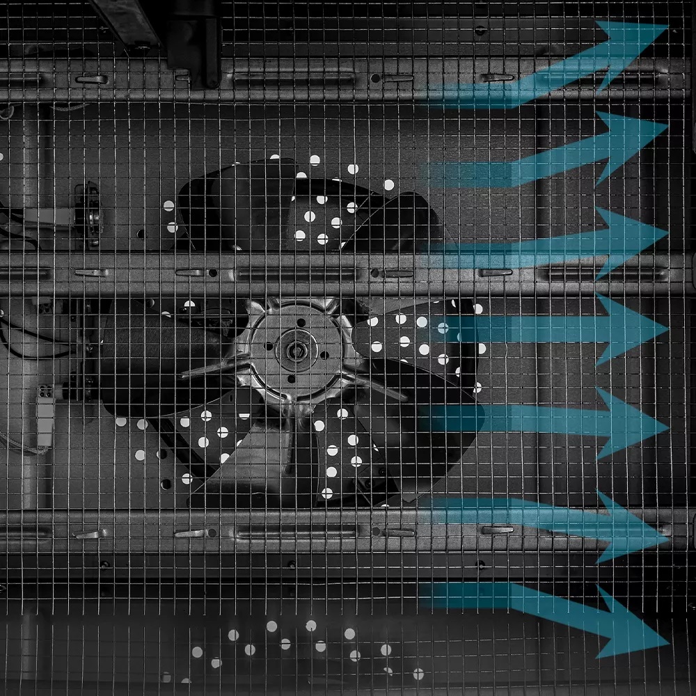 Сушилка оборудована большим мощным вентилятором, что обеспечивает равномерный горизонтальный обдув всех 8 поддонов. Поток воздуха направлен горизонтально, поэтому запахи продуктов с разных поддонов не смешиваются.