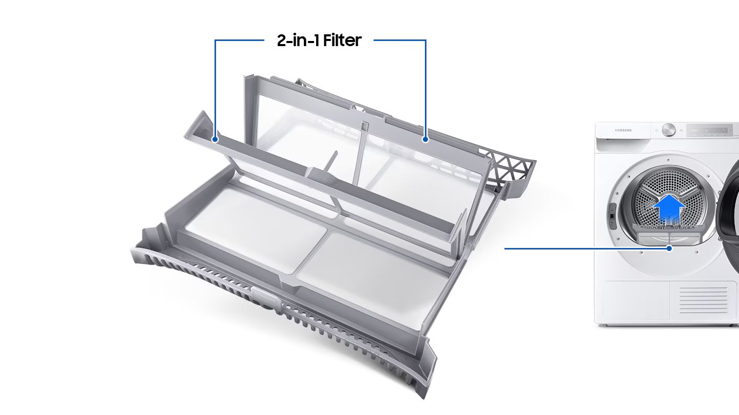 Ухаживайте за вашей сушильной машиной с легкостью. Эффективный двухступенчатый фильтр представляет собой двухслойный сетчатый фильтр. Вам не потребуется обслуживать другой труднодоступный фильтр теплообменника. А двойной звуковой сигнала напомнят вам о необходимости очистки фильтра.