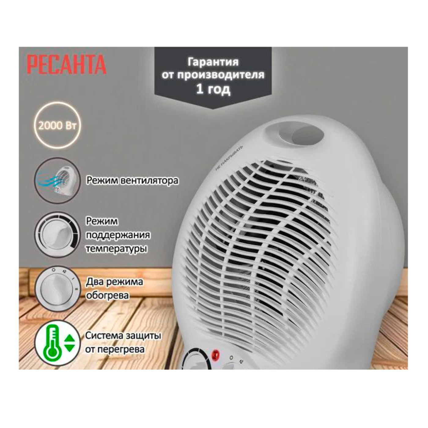 Тепловентилятор Ресанта ТВС-2 - прибор бытового назначения, который используется для обогрева помещения. Устройство имеет три режима работы: вентилятор, обогрев на пониженной и высокой мощности. Тепловентилятор оснащен защитой от перегрева, что