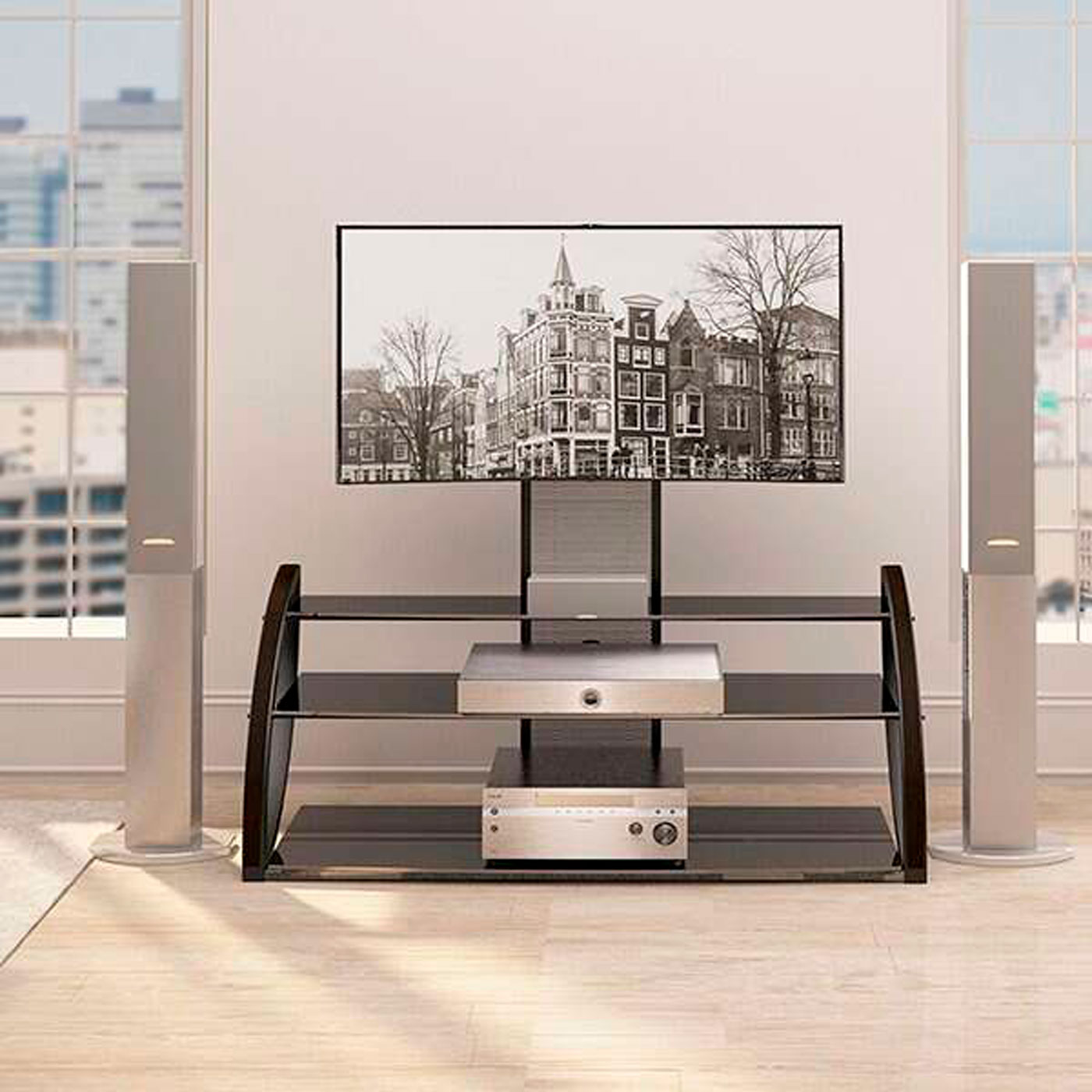 Тумба с кронштейном для LCD сделана из закаленного стекла и металлического каркаса. Такая конструкция выдерживает телевизоры весом до 50 кг. и с максимальной диагональю 65 дюймов. В комплекте тумбочки три полки. Безупречный дизайн вписывается в любой интерьер. Также можно регулировать высоту кронштейна.