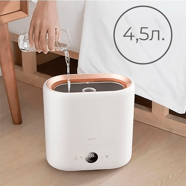 Резервуара для воды объемом 4.5 литра. Хватает на увлажнение в течение 16 часов. Для добавления воды в резервуар, Вам достаточно снять верхнюю крышку устройства и долить необходимое количество жидкости.