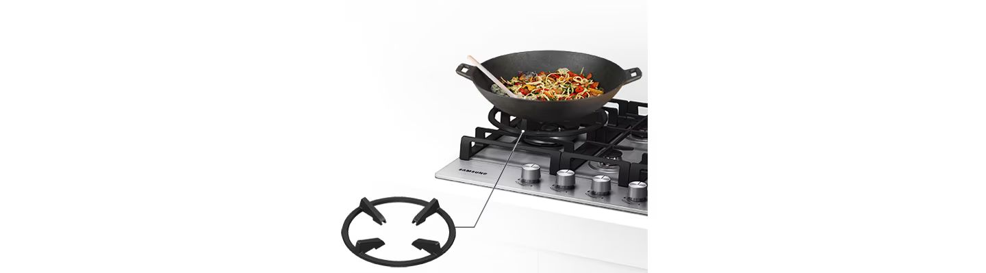 Газовая варочная поверхность Samsung оснащена специальной решеткой для приготовления на сковороде "Вок". Ее круглая форма позволяет обеспечить устойчивость "Вока" или других больших кастрюль во время приготовления. Наконец, посуда всегда будет находиться над центром конфорки, так что разогрев будет равномерным, а блюда - сочными и вкусными.