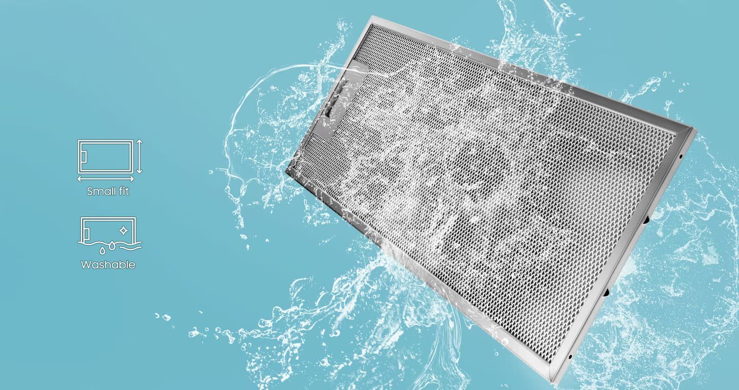 Долговечный и легкоочищаемый алюминиевый фильтр собирает пыль и испарения жира, предотвращая засорение мотора и лопастей вентилятора. Фильтр требует очистки всего раз в 3-4 недели, что очень просто, ведь фильтр с лёгкостью помещается в посудомоечную машину.