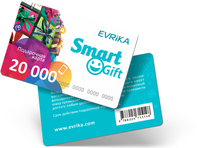 Smart Gift-сыйлық ретінде сатып алуға болатын белгілі бір номиналы бар пластикалық сыйлық картасы. Бұл картаны сыйлық ретінде алған адам EVRIKA дүкенінің ассортиментінен тауарды карта номиналының сомасына төлей алады.